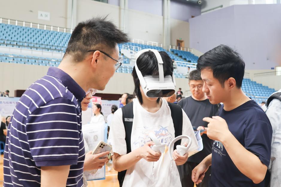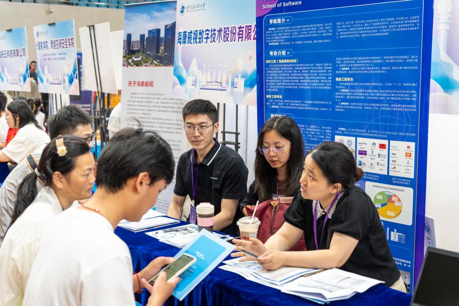 为了更好地解答考生与家长对招生政策的疑问,体育馆一楼设置了“招生政策咨询区”,招办老师与实验班学子为大家提供个性化的建议和指导。同时,场馆内精心布置“专业路演体验区”,让考生与家长更全面地了解各学院的专业特色和优势。今年,我校还邀请优秀毕业生就职的优质名企来校搭建“优质名企互动区”,分享入职毕业生在职业发展道路上的成功经验和方向。省梁丰高级中学的王同学正认真聆听着产教融合拔尖班的讲解:“企业的合作办学也很吸引我!优秀的深造率和我个人的未来规划很契合。”
