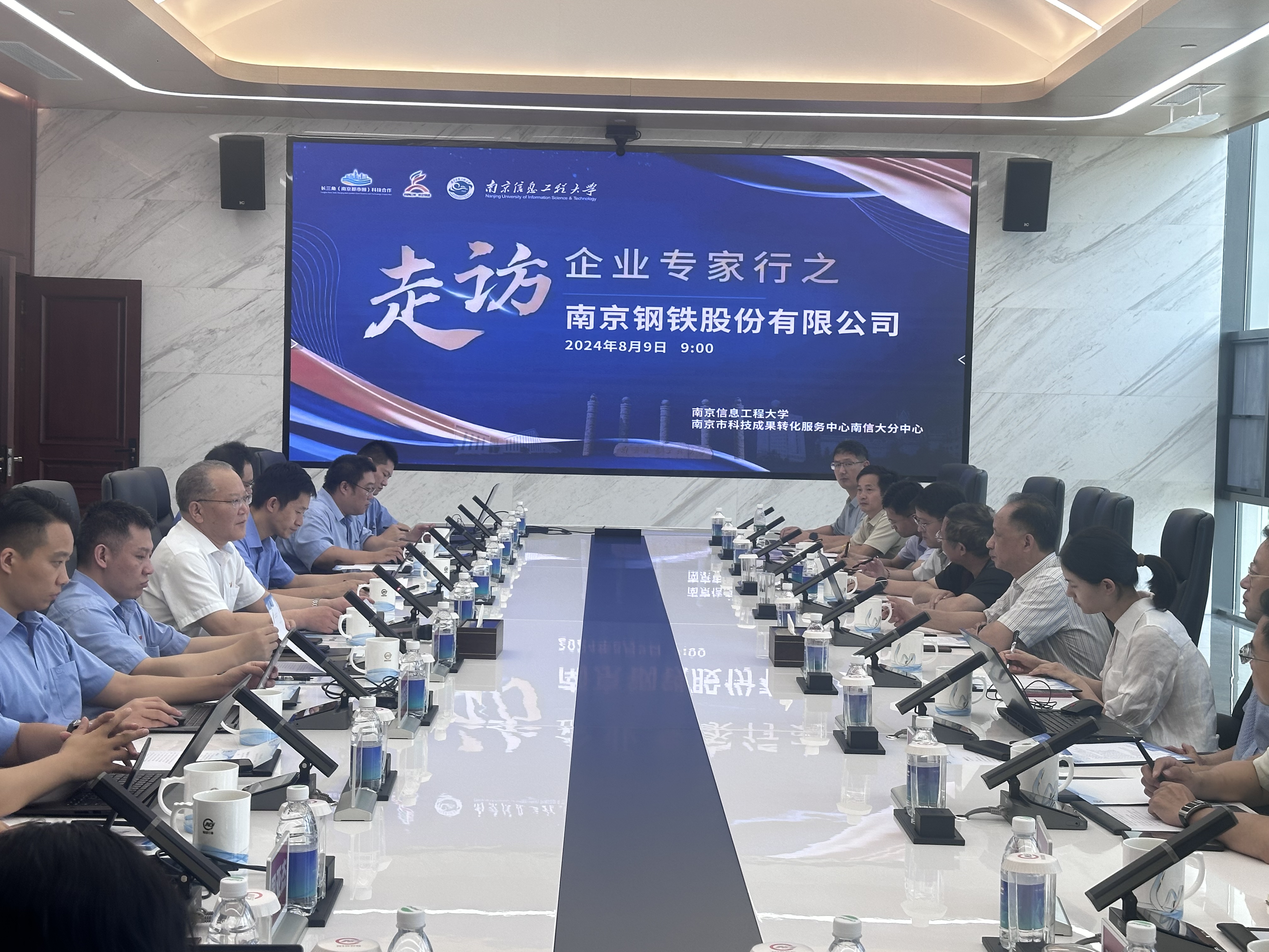 8月9日,我校专家团队一行15人赴南京钢铁集团有限公司(以下简称“南钢集团”)走访交流,旨在深化双方在钢铁产业进行人工智能技术应用的研究合作,推动产学研深度融合。南钢集团总裁助理孙茂杰、南钢新材料研究院院长陈林恒、南京市科技成果转化服务中心汤贤娟,我校科技产业处处长王军出席会议,会议由孙茂杰主持。