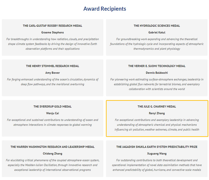 美国气象学会(AMS)是一个致力于推进大气及相关科学的专业组织。该学会每年颁发奖项和荣誉,以表彰在这些领域中作出卓越贡献的科学家。张人一教授所获得的Jule G. Charney 奖是美国气象学会最高奖,颁发给世界范围内大气科学和水文科学领域中取得杰出成就的个人。