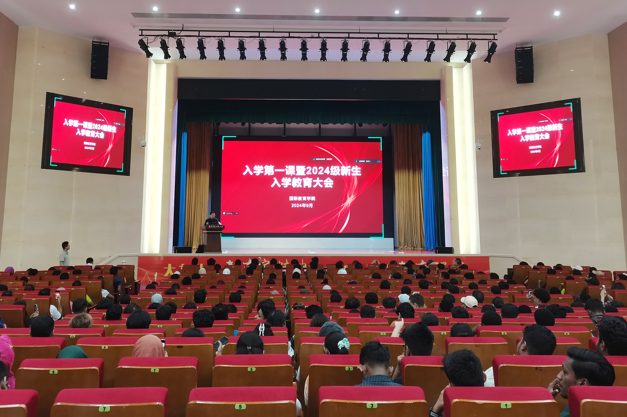9月12日上午,国际教育学院在风云剧场组织召开了2024级新生入学第一课暨新生教育大会。