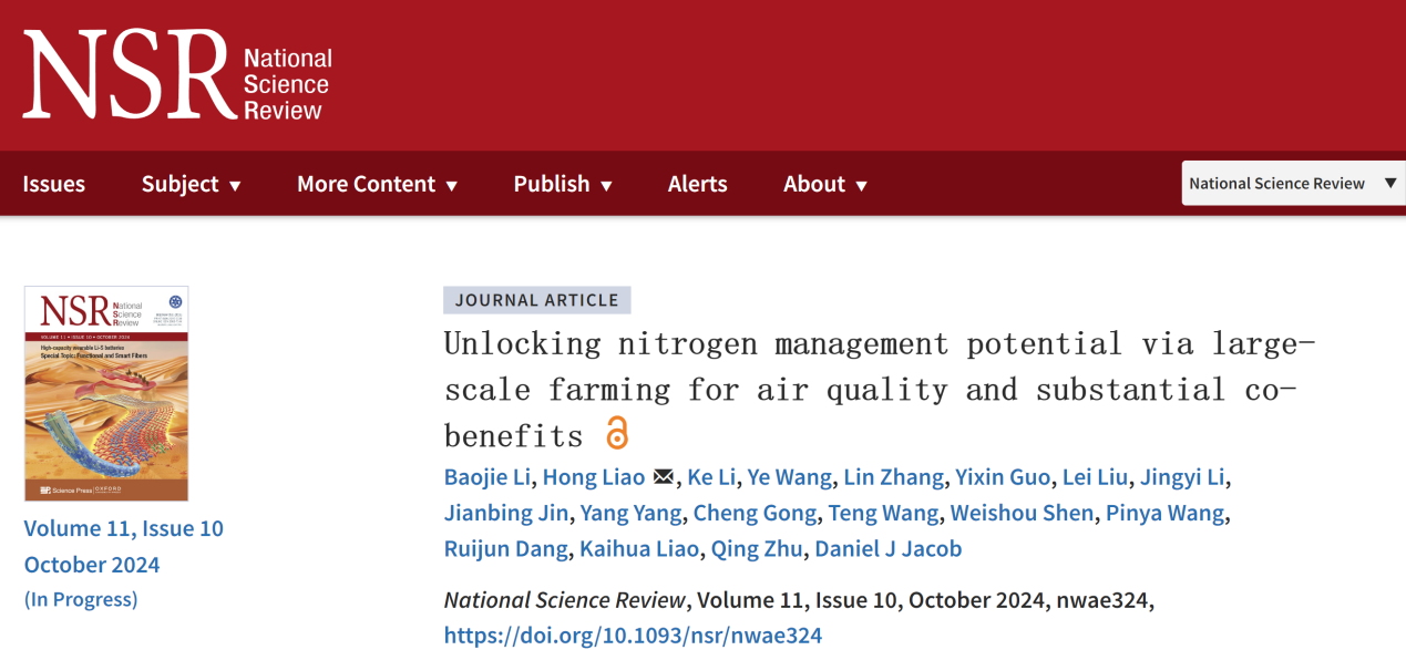 近日,我校环科院廖宏教授团队在国际权威期刊《National Science Review》发表了题为“Unlocking Nitrogen Management Potential via Large-scale Farming for Air Quality and Substantial Co-Benefits”的研究论文。研究通过多模型集成方法,首次系统性评估了农业规模化与氮素管理相结合对中国氨排放、空气质量和经济效应的综合影响。