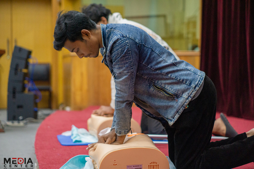 本次培训活动分理论学习、操作演示和亲身实践三个环节展开。首先,王士荣向留学生们普及了一些常见传染病以及如何预防的知识。随后,王士荣由浅入深、通俗易懂地讲解了紧急情况下关节扭伤的现场处理、心肺复苏(CPR)的操作流程、自动体外除颤器(AED)的使用,以及气道异物梗阻的现场处理。