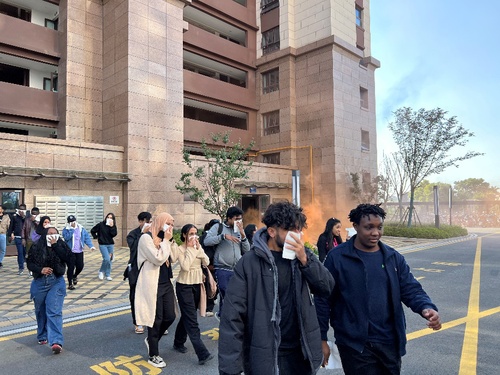 李岩首先向留学生们阐明了火灾的危害性,日常预防的重要性以及此次演练的必要性。他要求留学生们在思想上要时刻保持警惕,不能麻痹大意;在行为上要严格遵守宿舍管理规定,切实做到安全、规范用电,消除一切火灾隐患。同时他希望留学生们能高度重视本次演练实训、积极参与,认真学习、熟练掌握紧急情况下的应对措施。