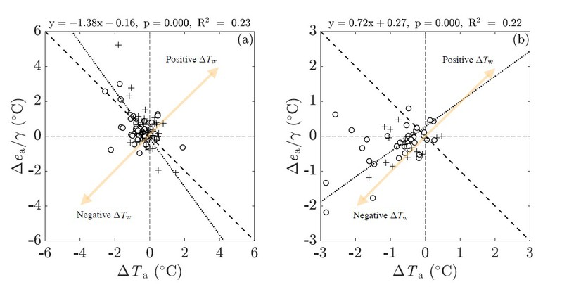 研究组采用一款智能温湿度传感器Smart-T,用自行车在全球15个城市的114个绿地测量温度和湿度。采用热力学的湿球温度函数,将湿热胁迫分解为温度和湿度分量(图1)。结果表明,在白天,绿地一方面可以有效降低温度,另一方面由于蒸发作用会增加湿度;这种降温和增湿效应往往相互抵消,导致湿球温度的变化可忽略不计。而在夜间,绿地由于土壤热储量减少,能够同时降低温度和湿度,从而缓解湿热胁迫。该研究表明,在选择城市热胁迫的应对策略时,湿度和温度同等重要。