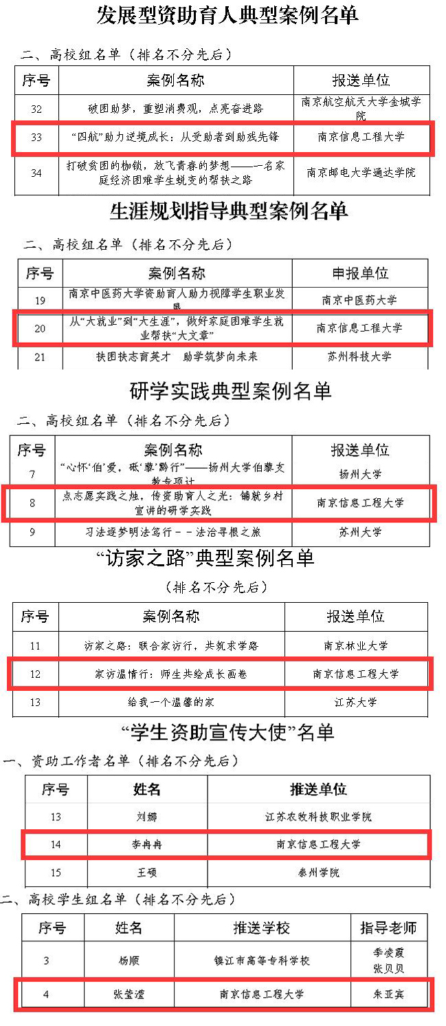 在案例类项目评选中,我校辅导员丁杰老师的《“四航”助力逆境成长:从受助者到助残先锋》获评发展型资助育人典型案例;学生工作处王韵璐老师的《从“大就业”到“大生涯”,做好家庭经济困难学生就业帮扶“大文章”》获评生涯规划指导典型案例;研究生工作部佘正昊老师的《点志愿实践之烛,传资助育人之光:铺就乡村宣讲的研学实践》获评研学实践典型案例;辅导员钱锐老师和学生工作处李冉冉老师共同创作的《家访温情行:师生共绘成长画卷》获评 “访家之路”典型案例。在“学生资助宣传大使”项目评选中,学生工作处李冉冉老师获评“江苏学生资助宣传大使(资助工作者)”,遥感与测绘工程学院2021级本科生张莹滢(指导老师朱亚宾)获评“江苏学生资助宣传大使(学生)”。