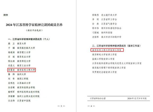 近日,江苏省科协公布了2024年江苏省科学家精神宣讲团入选名单,全省共遴选出20名宣讲团成员及6家宣讲工作室。我校科协推荐申报的马克思主义学院肖雷波副教授、南京信息工程大学宣讲工作室入选2024年江苏省科学家精神宣讲团成员名单,入选数量位居全省前列。