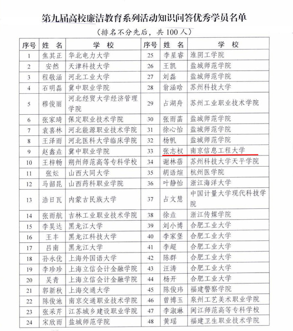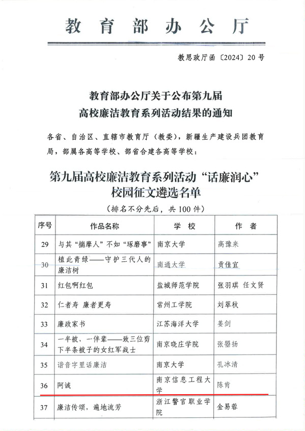 近日,教育部第九届高校廉洁教育系列活动落下帷幕,我校在两个项目的评比中获奖,教师教育学院陈肯同学的征文作品《阿诚》入选“话廉润心”百篇优秀征文。大气科学学院张志权同学获评廉洁知识问答优秀学员(全国高校共评选100名)。
