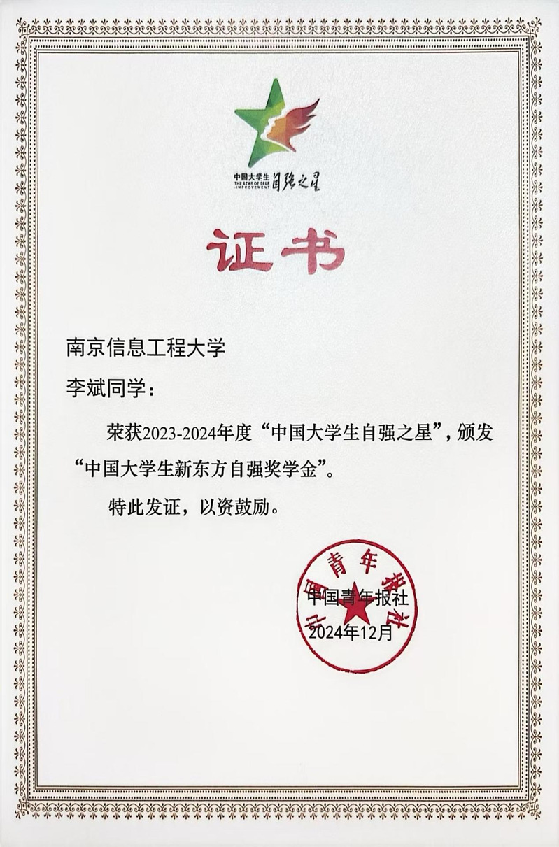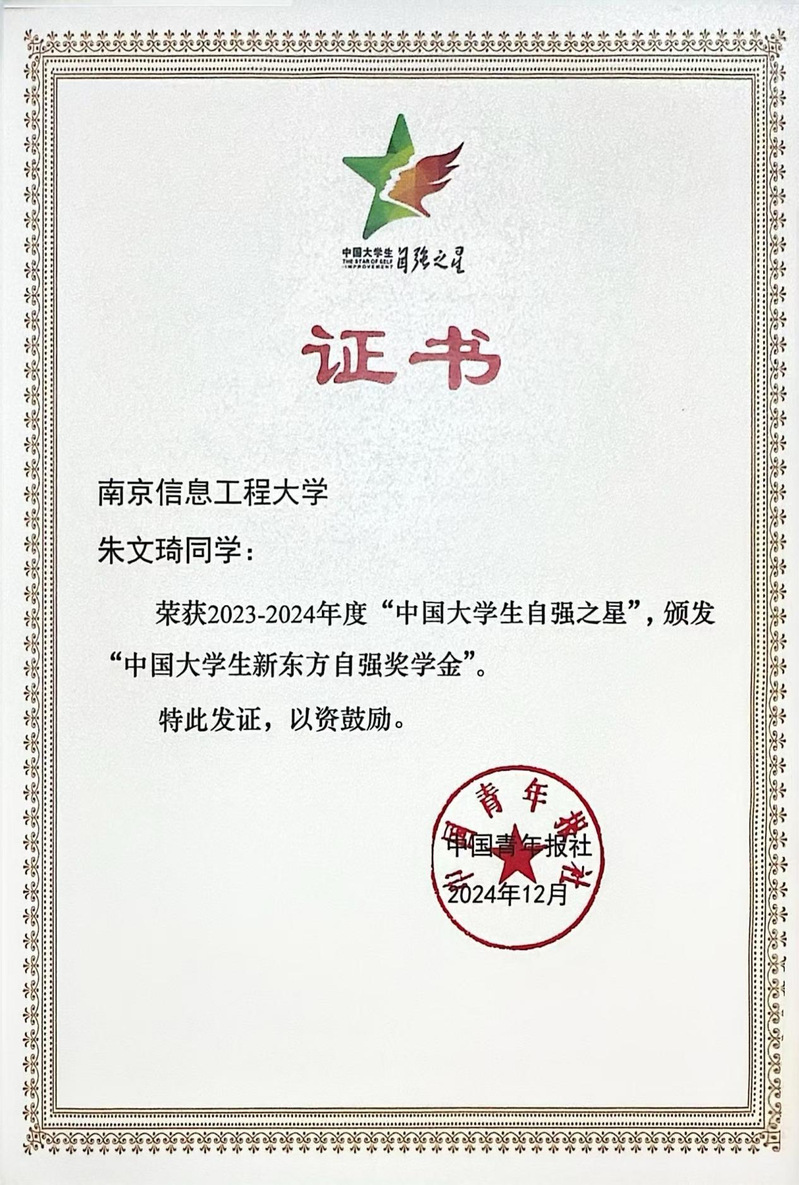 近日,由共青团中央、全国学联指导,团中央基层建设部、中国青年社报主办的2023-2024年度“中国大学生自强之星”奖学金评选结果公布,经学校推荐、省级初评、全国评审等环节,我校管理工程学院2020级本科生朱文琦、地理科学学院2023级研究生李斌荣获2023-2024年度“中国大学生自强之星”。