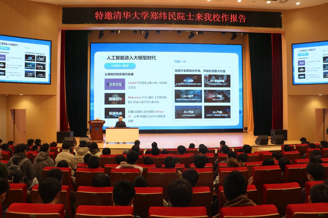 赵强首先对郑纬民院士的到来表示热烈欢迎和衷心感谢。他指出,当前人工智能技术正飞速发展,AI大模型已成为推动科技创新和社会进步的关键力量,高校作为人才培养和科研创新的重要基地,应积极顺应时代潮流,加强相关领域的研究与实践。他表示,我校计算机学院近年来在学科建设、人才培养等方面取得了显著成绩,希望以此次讲座为契机,进一步深化与行业专家的合作交流,积极探索AI大模型在教学与科研中的应用,培养更多适应时代需求的高素质人才。