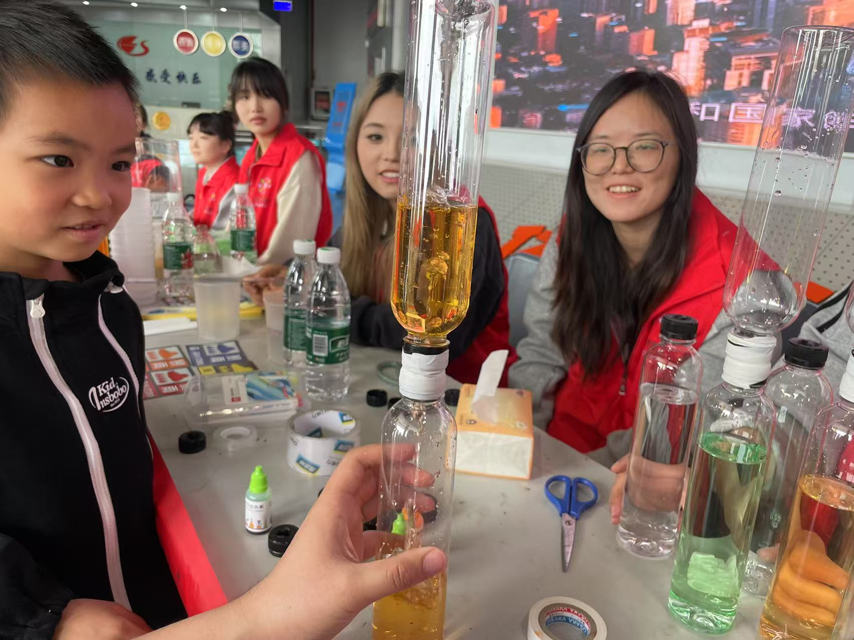 在一旁指导的研一志愿者李品茉告诉记者,“这些模拟实验都是我们学生自己设计的,希望通过这些有趣的实验,让大家更直观地了解气象知识。像模拟龙卷风实验,利用离心力模拟龙卷风的旋转运动,简单又有趣。”