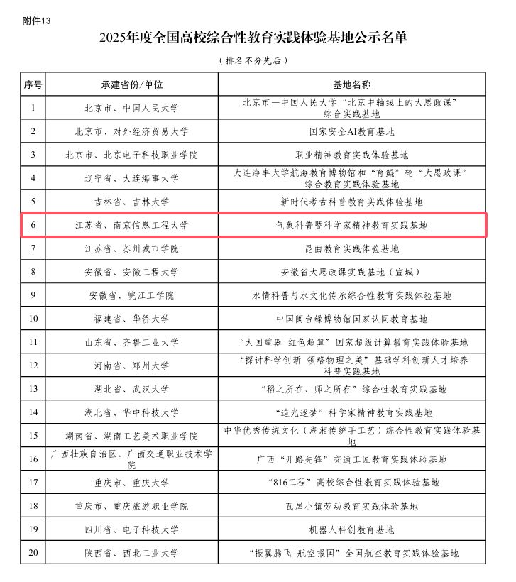 近日,教育部公布了2025年度高校思想政治工作质量提升综合改革与精品建设项目遴选结果,我校“气象科普暨科学家精神教育实践基地”入选全国高校综合性教育实践体验基地,实现了我校在教育部该建设项目的突破。