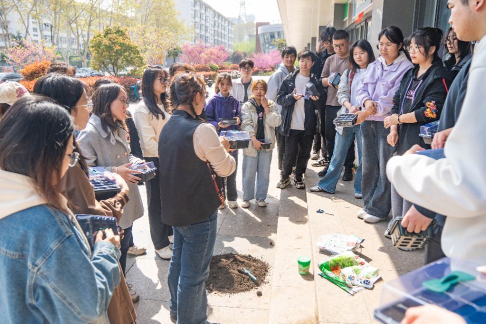 活动伊始,刘伟老师讲述了关于种子萌发的知识,讲述了如何通过播种方式提升种子发芽率,并亲自示范育苗流程。随后,同学们踊跃参与实操,不仅将所学知识运用起来,还积极创新,不少同学尝试“一盒两育”甚至“一盒三育”的多元种植方式。部分同学还设置了对照组,通过控制光照、温度等变量,探究天气因素对蔬菜种子在育苗生长过程中的影响。活动尾声,同学们为自己的育苗盒精心绘制独特标记,并整理清洁现场。三十余个承载着期待的育苗盒被整齐摆放在春日暖阳下,静待破土发芽。