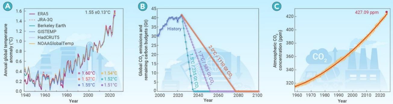 极端事件频发、气象灾害损失加剧背景下,迫切需要减少全球温室气体排放,但目前没有任何迹象表明世界已经达到化石燃料二氧化碳排放峰值。2024年全球年均气温首次突破工业化前水平1.5°C的临界线,化石燃料碳排放量和大气二氧化碳浓度亦创历史新高,充分暴露出当前全球气候行动的不足。据估算,如果所有最新的国家自主贡献(NDCs)都得到充分实施,2030年相较2019年排放量可能会减少5.9%,但这仍然不足以支撑《巴黎协定》1.5°C控温目标的实现。然而,2025年2月新的气候目标截止日期,大多数国家未能及时提交其更新的国家自主贡献,需要在国家层面采取广泛且一致的气候行动。由于最严重的全球性风险中与气候相关的风险尤为突出,适应气候变化成为当务之急。截至2025年1月,全球有62个国家向联合国气候变化框架公约(UNFCCC)提交了国家适应计划(NAPs)。然而,世界在应对现有气候方面表现得严重不足,2024年自然灾害保险损失连续第五年超过1000亿美元。新的集体量化目标(NCQG)将2020年之前每年1000亿美元的旧目标替换为2035年之前每年3000亿美元的新目标,以期加速发展中国家的气候变化适应活动。然而,许多专家和发展中国家认为,3000亿美元的融资目标不足以应对气候变化带来的挑战。面对日益严峻的气候危机,全球需加快减排步伐,强化技术创新与协同合作,推动发达国家承担历史责任,并统筹推进减缓与适应的综合应对策略。