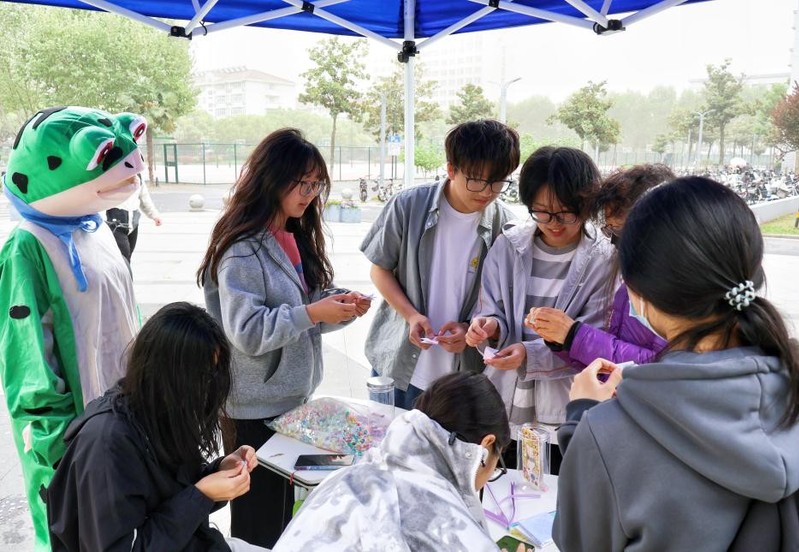 活动伊始,参与者在签到处领取色彩斑斓的手工纸,折叠象征希望的星星和千纸鹤并投入许愿罐。随后在自由拥抱区域,一名身着青蛙玩偶服的工作人员张开双臂,为参与者提供一个温暖的拥抱。活动结束后,每位参与者均领取到了糖果作为活动纪念。