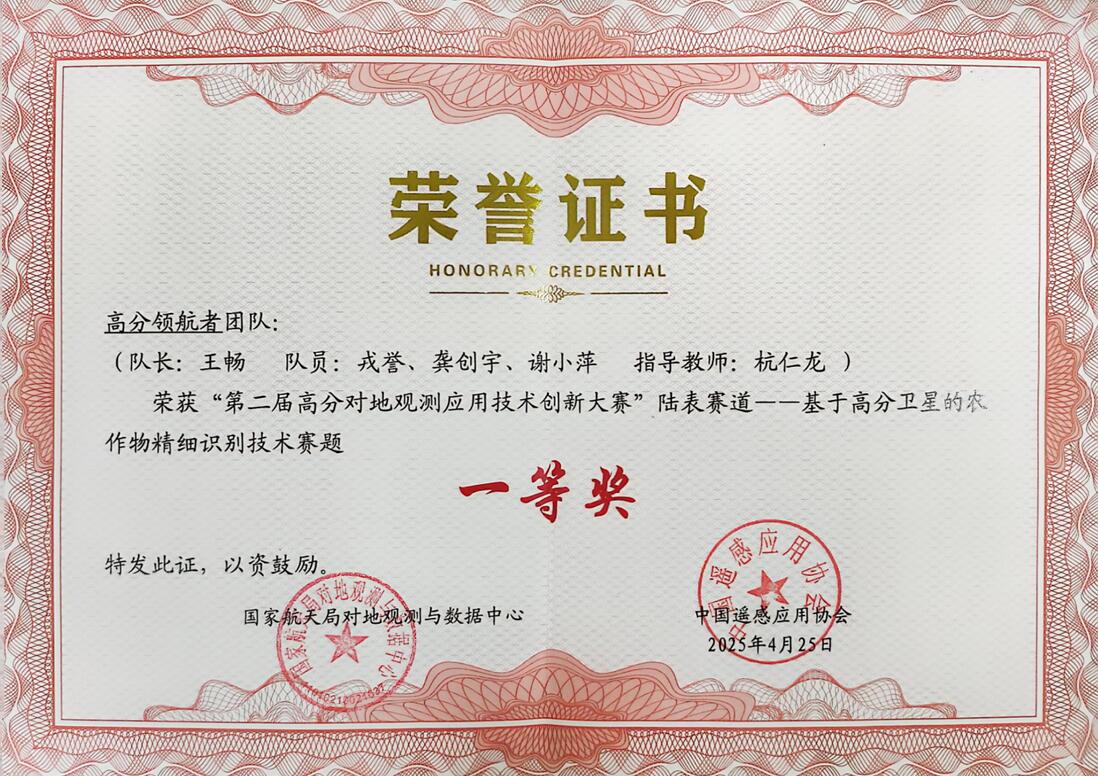 自2024年10月开赛以来,来自全国各地各部门共342支队伍同台竞技,历经初赛(342支队伍)、复赛(105支队伍)和全国总决赛(34支队伍)层层激烈角逐,由计算机学院、网络空间安全学院研究生王畅(队长)、戎誉、龚创宇和江苏省气候中心谢小萍博士组成的“高分领航者”团队(指导教师:杭仁龙)荣获一等奖(全国共5支队伍)。